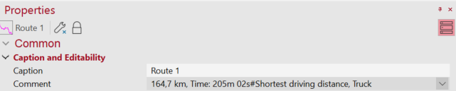 You will then get a graphic in the Contents control window that includes your route. In the properties of the graphic, you can now see which calculation type and means of transport you had selected.